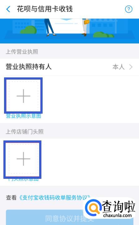 再上传营业执照的照片和店铺的门头照,点击下方的“同意协议并提交”,等待几天支付宝后台审核通过之后,就可以开通花呗和信用卡收钱了。