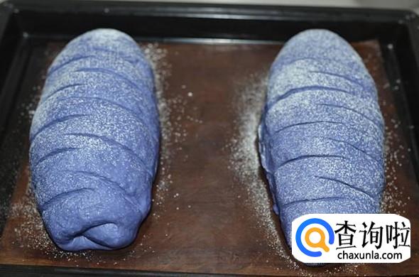 放入模子中,盖上盖子,继续常温发酵1小时,至8分满的时候放入烤箱,170℃,45分钟就可以取出了。完美的蓝色多瑙河吐司就完成啦!