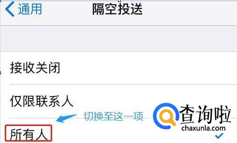 点击通用以后,我们会在新页面中看到“隔空投送”,没错,它就是用来共享文件的,系统默认的投送对象是“仅限联系人”,为了便于分享,我们可以将其切换至“所有人”;