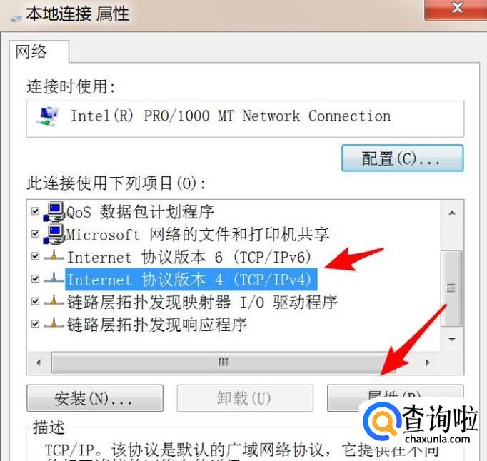 打开后,点击选中ipv4,然后点击‘属性’按钮。