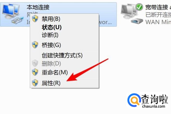 打开后,右键点击‘本地连接’,在菜单上点击‘属性’