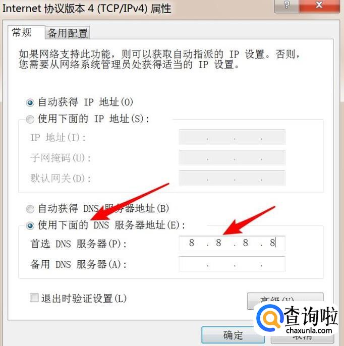 打开后,不要选中自动获取DNS的选项,而是选择下面的,然后输入DNS的地址,用8.8.8.8这个dns就行了。