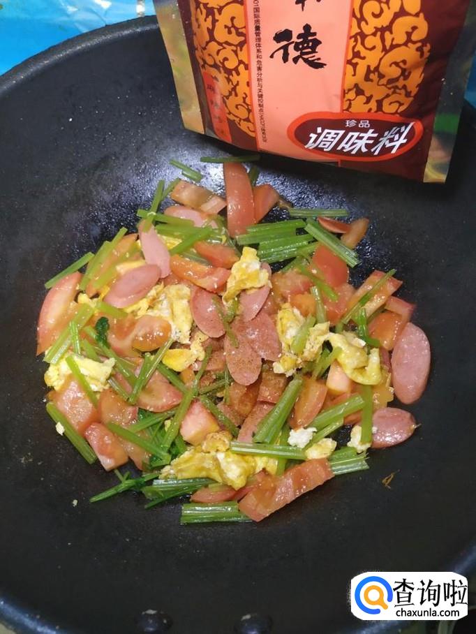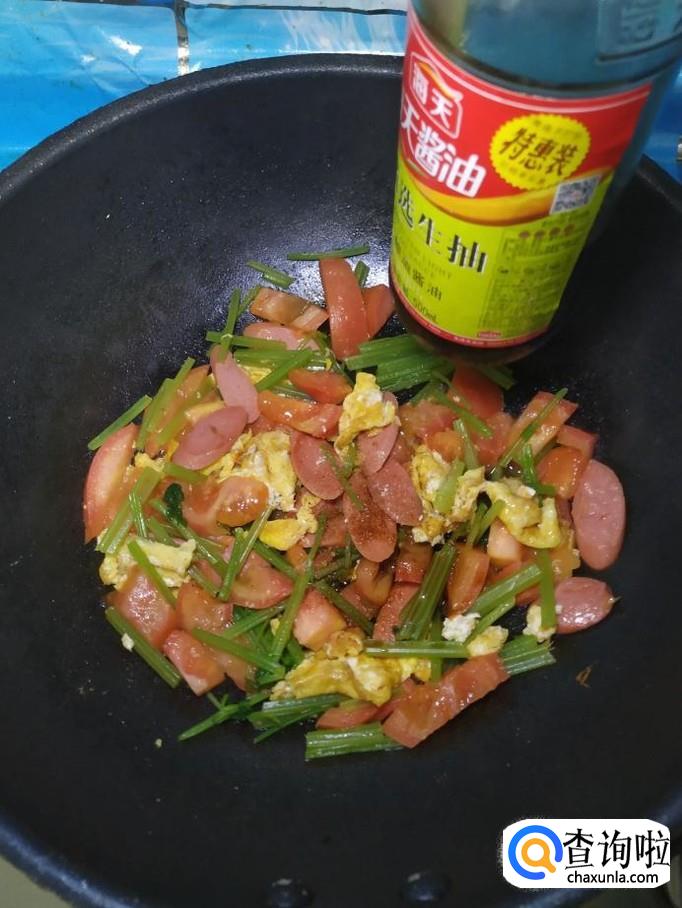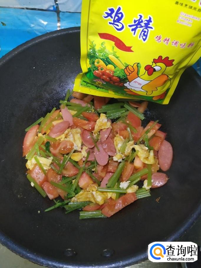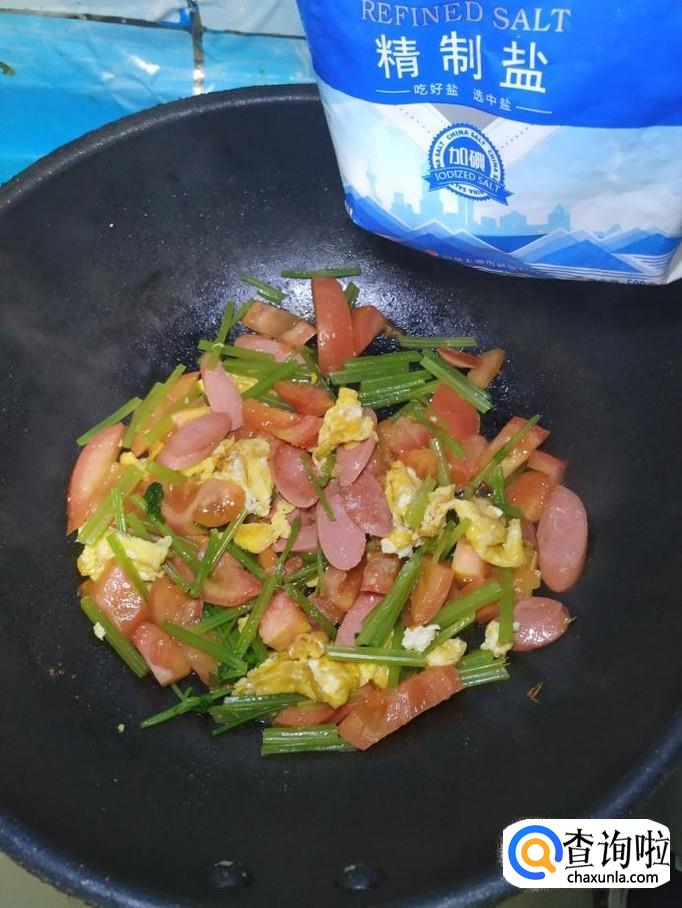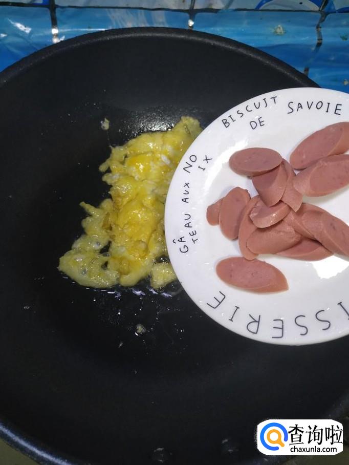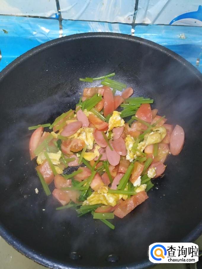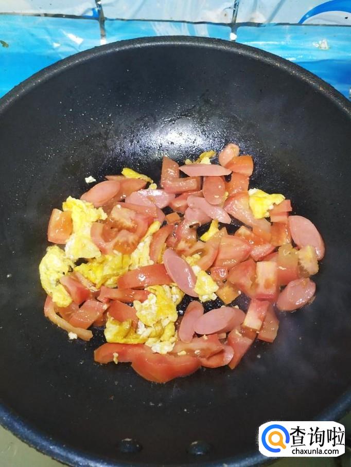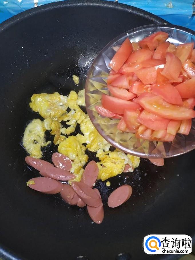 将火腿肠和西红柿倒入锅中,和鸡蛋一起翻炒均匀。