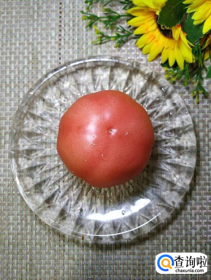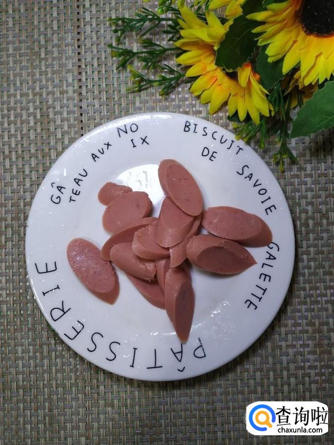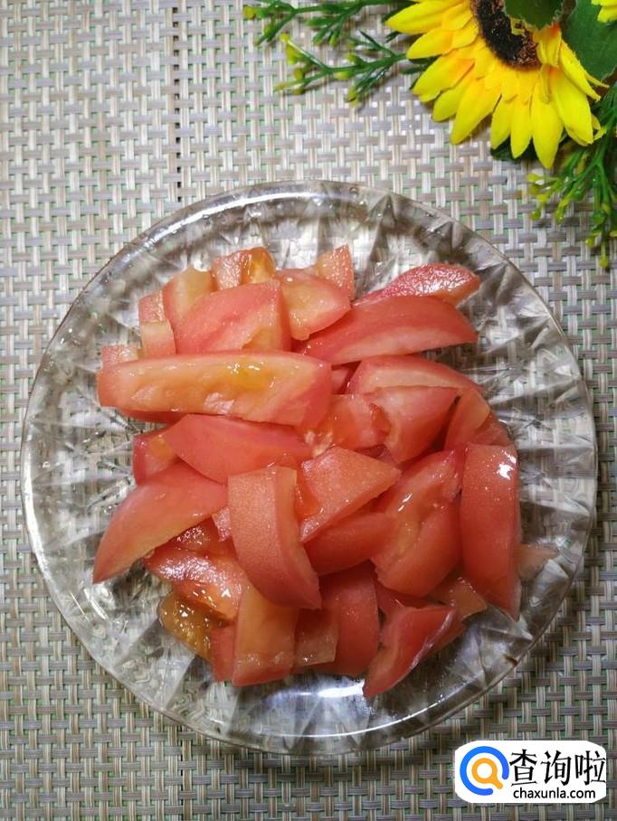 准备一个西红柿,洗净后,切成块放入盘中备用,再准备适量的香肠,去除外衣,切片备用。