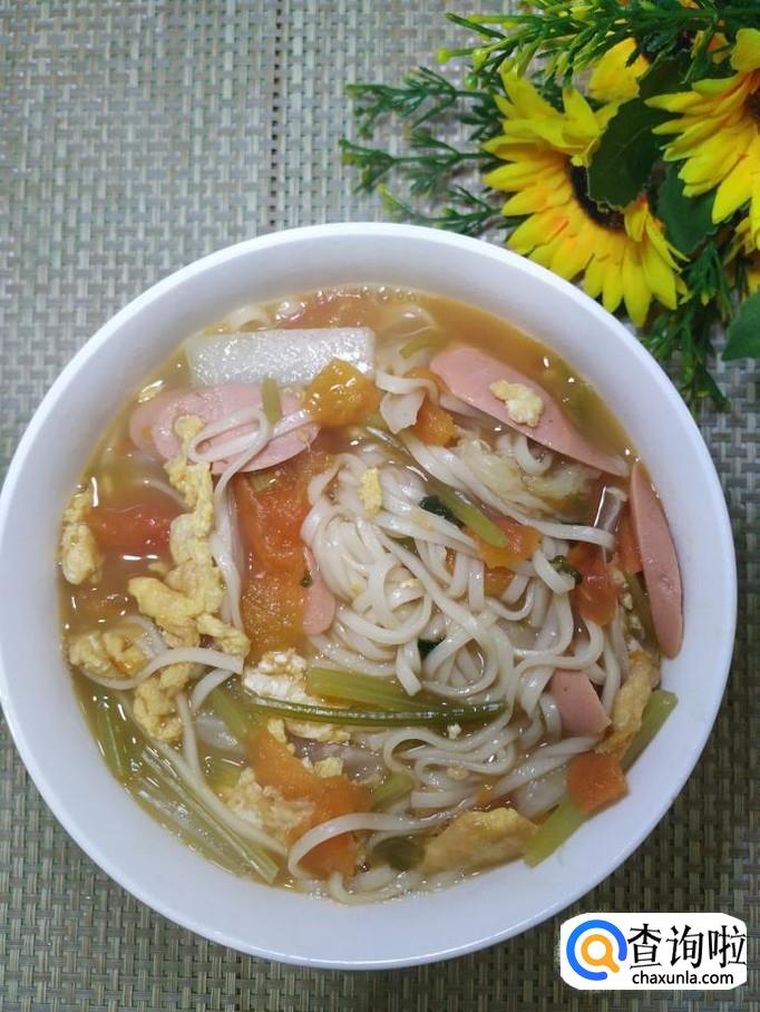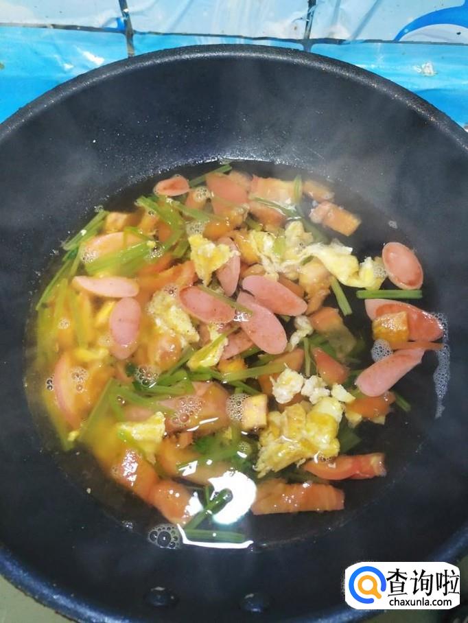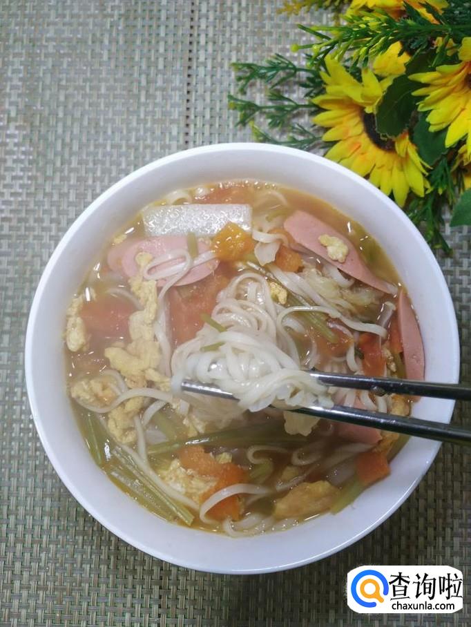 芹菜适量,西红柿适量,香肠适量,面条适量,鸡蛋适量,盐适量,鸡精适量,五香粉适量,生抽适量,陈醋适量。