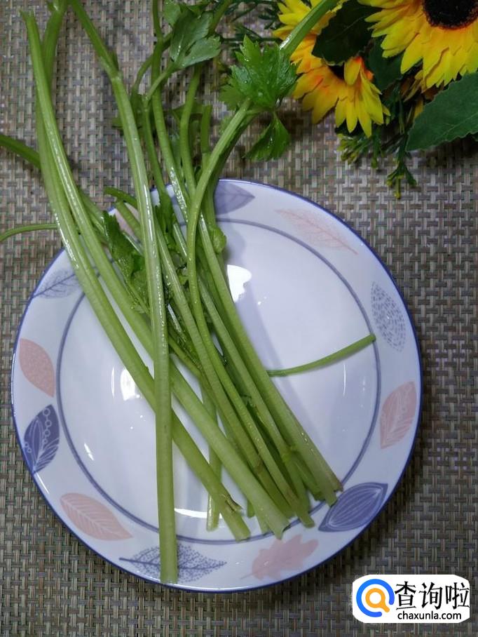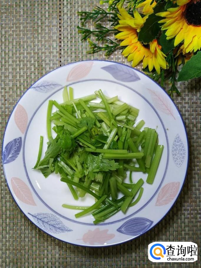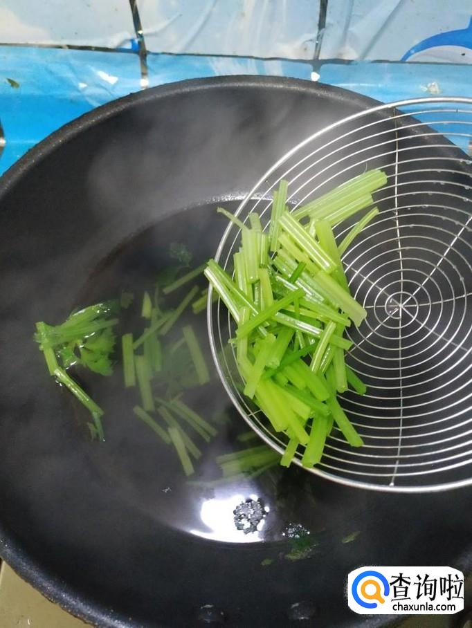 准备适量芹菜,洗净后切成段,放入锅中焯水,焯好之后,盛出备用。