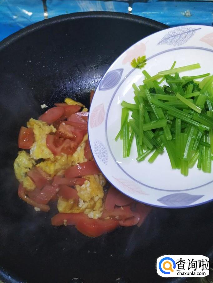 将芹菜段倒入锅中,翻炒均匀,芹菜段已经焯过水了,很容易熟。