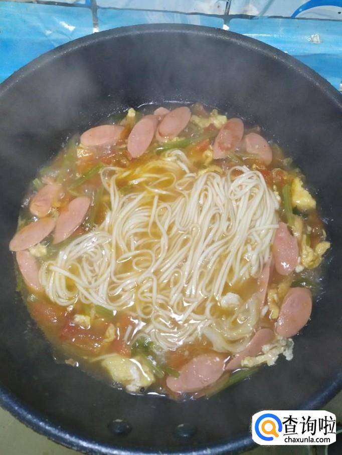 另外再起一个汤锅,加入适量清水,大火将水烧开后,放入面条煮熟,将面条捞出,放入炒好的芹菜西红柿鸡蛋汤中。