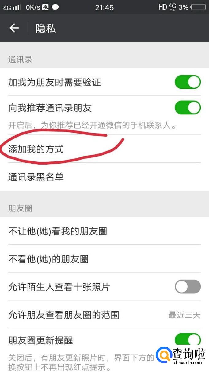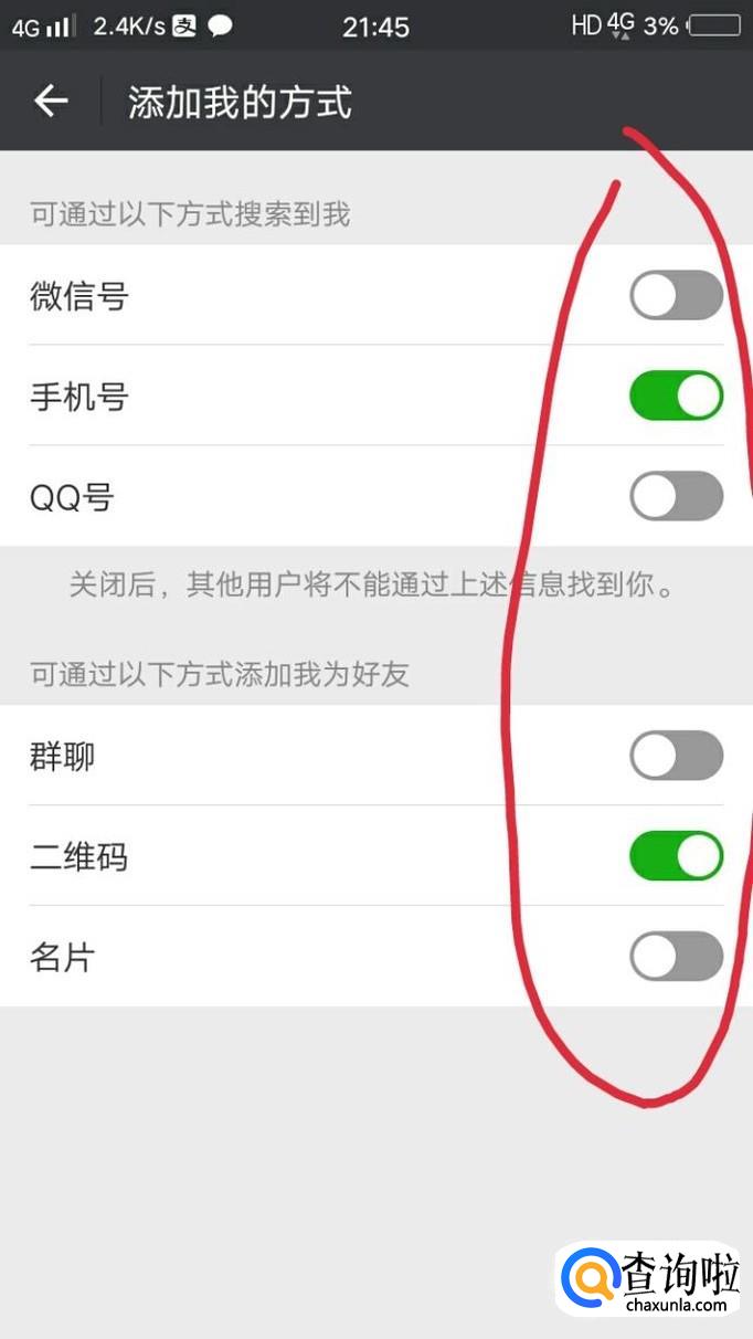 最后会出现如下图所示的界面,自己可以随意选择开与关,这样别人就可以通过一定的方式添加你。