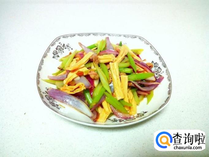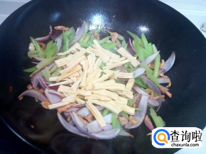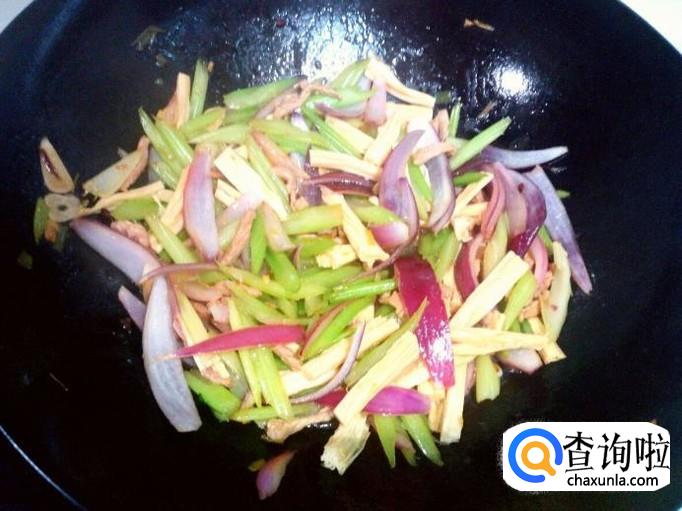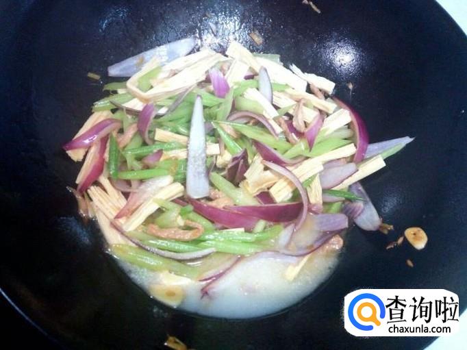 芹菜略翻炒一下,放入腐竹翻炒。炒至圆葱,芹菜断生,放入勾兑好的薄芡。