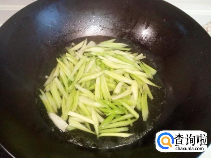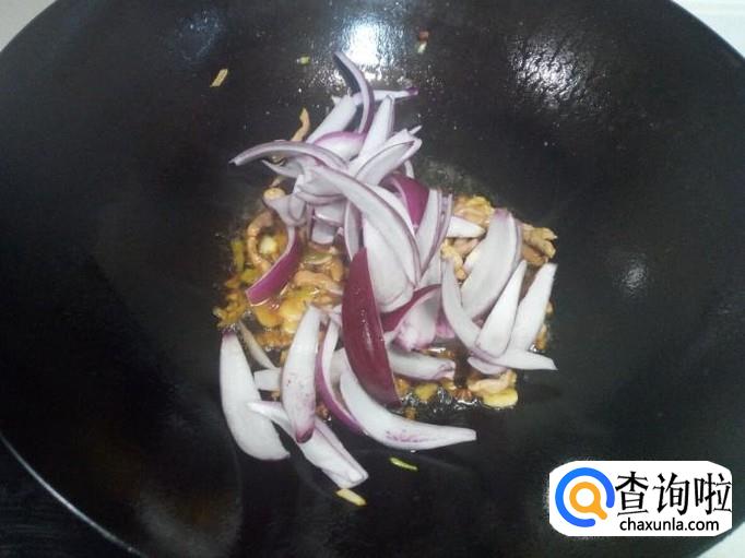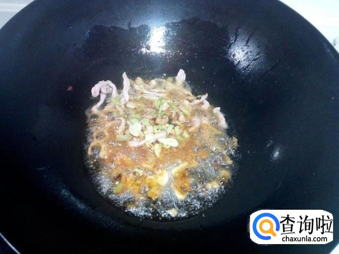 炒至肉丝颜色微白,放入料酒,少许酱油。放入葱,姜,蒜,翻炒。