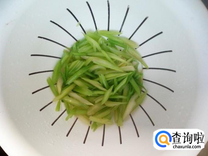 芹菜用开水焯一下,水开后,入锅十秒钟捞出,迅速用冷水过凉,沥干水分。