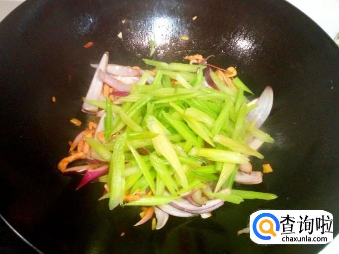 随即放入圆葱,滴少许醋,大火快速翻炒。圆葱略翻炒一下,放入芹菜翻炒。