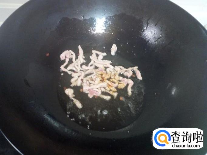 锅内放入油加热,油热后放入花椒爆锅,放入肉丝翻炒。