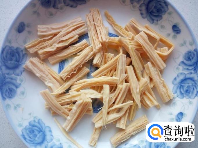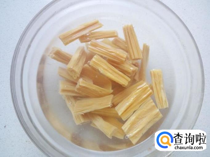 把干腐竹放入水中浸泡变软。把泡好的腐竹用水清洗干净,控干水分,切成条。