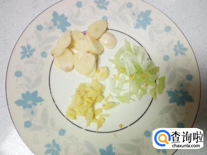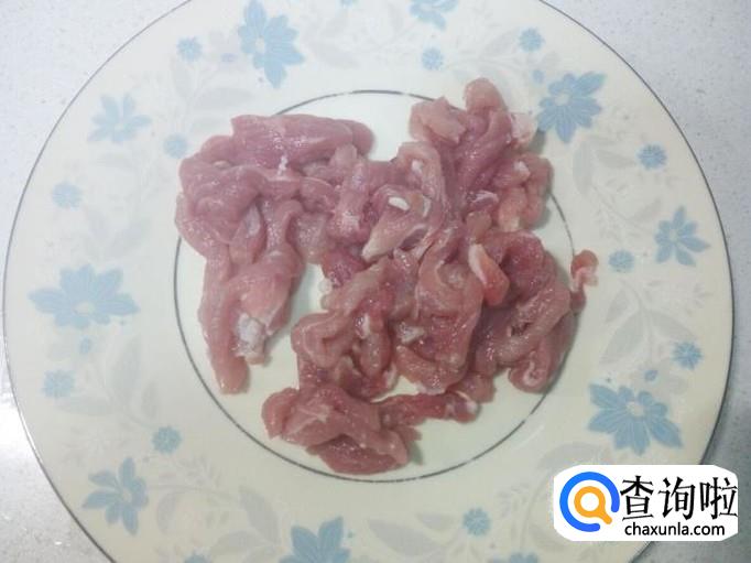 猪肉用水冲洗干净,控干水分,切成丝。切好葱,姜,蒜,备用。