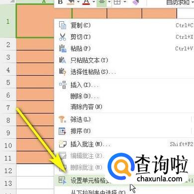 如图所示,选中A1单元格,再右击,弹出菜单再点:设置单元格格式