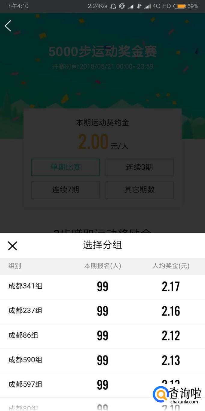 进入“运动奖金赛”页面后,可以直接点击“立即报名”,也可以切换比赛分组。