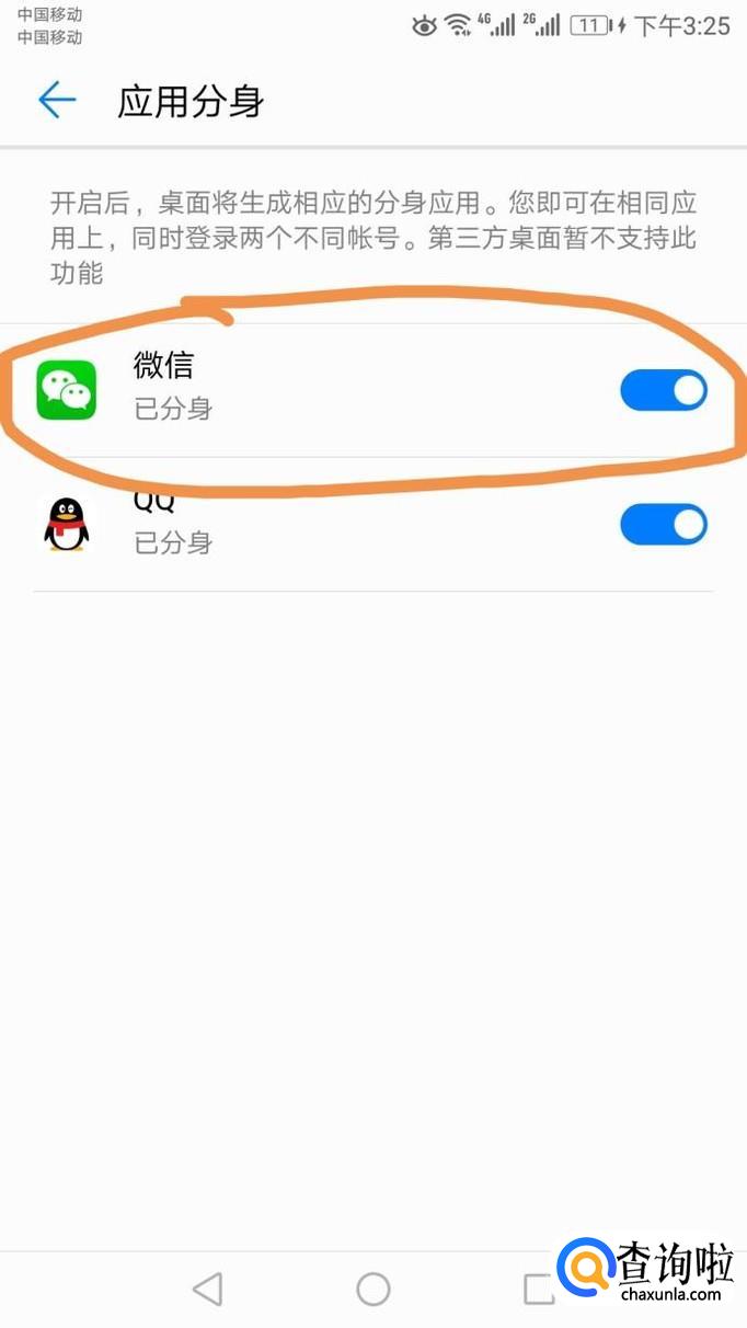 弹出的界面,我们将微信的分身开关向右划动打开,这样我们就可以登录两个微信了。