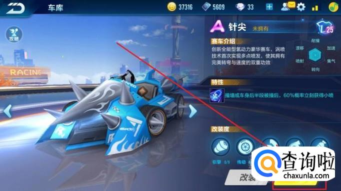 在车库的A级车中,找到并点击赛车“针尖”。