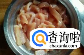 将买来的鸡胸肉切成细条,放入碗中加上盐料酒腌制三十分钟。