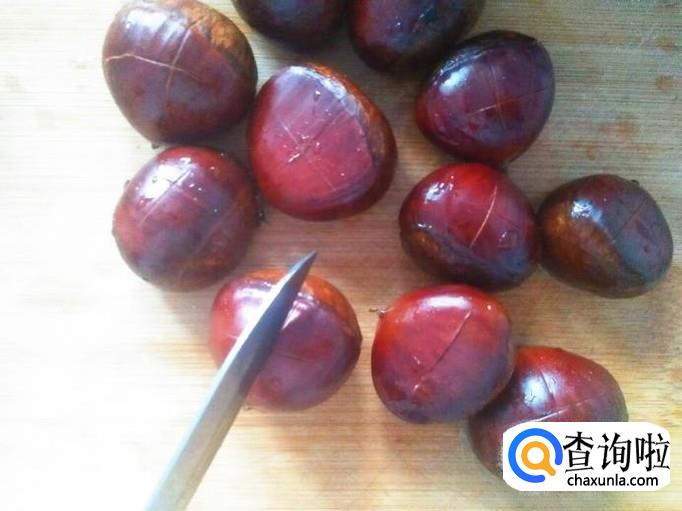 用刀子在栗子的表层划上一个十字,注意点别割伤手,生栗子比较硬不容易划开。另外告诉各位,划的别太深,我划的有些深,做好的栗子样子不是很漂亮。