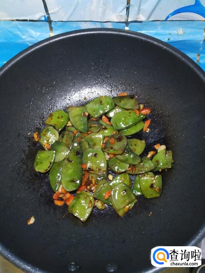 将之前煎过的扁豆,放入锅中翻炒均匀。