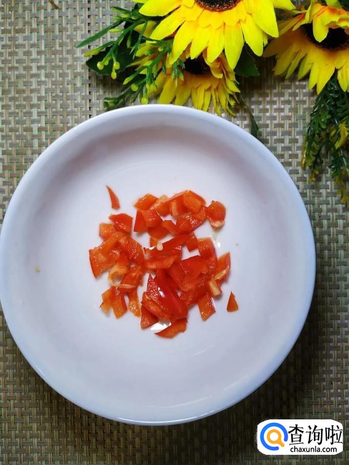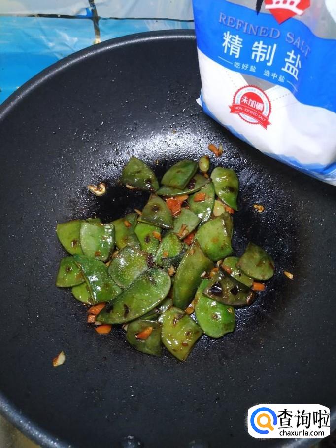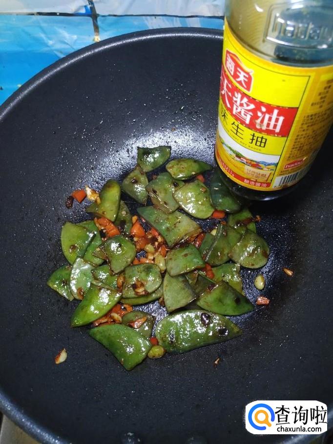 准备适量红椒,洗净后切碎,倒入锅中,和扁豆一起翻炒一下,这样可以让扁豆的色泽更加好看。