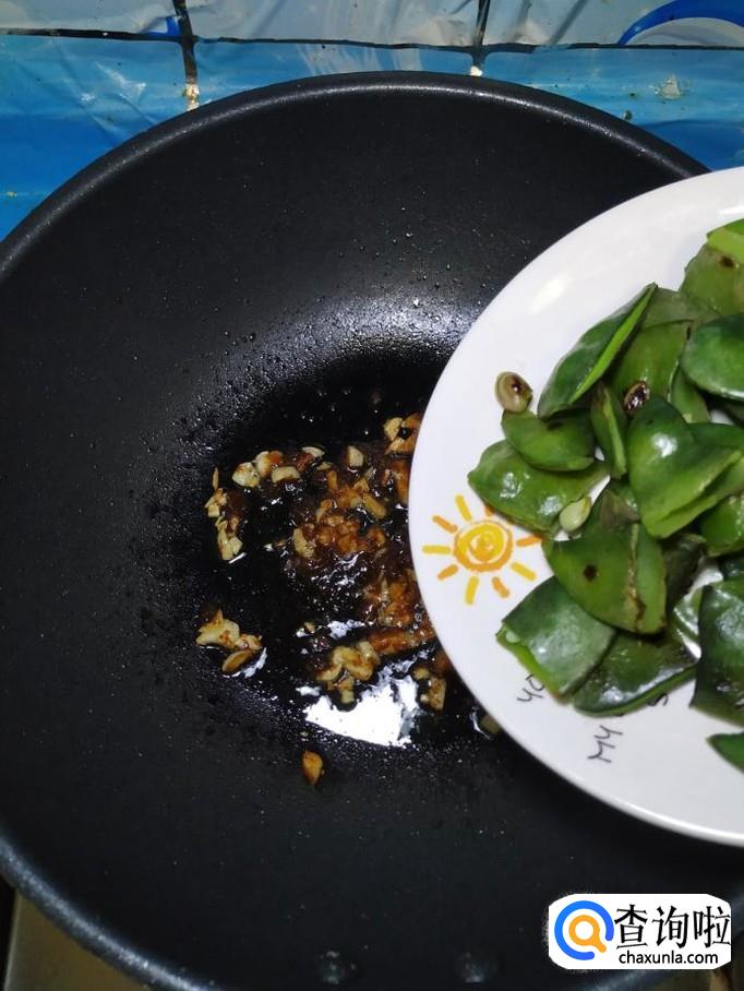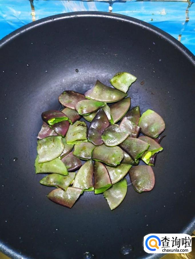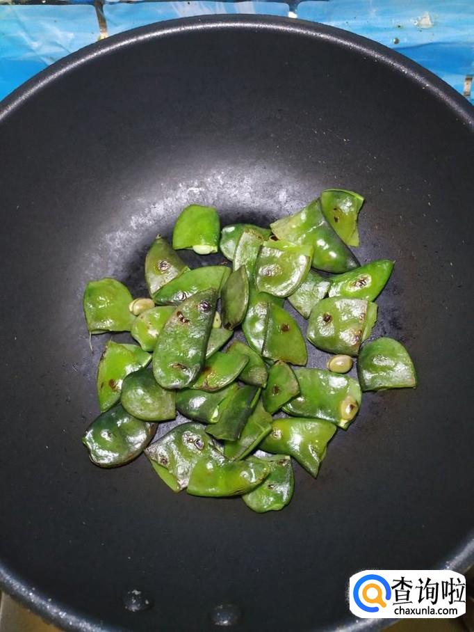 炒锅中不用放油,将扁豆倒入锅中,小火慢煎,煎至外表变软,稍微发黄,就可以盛出来,放入盘中备用。注意,一定要小火,否则即使扁豆外表黄了,里面也可能不熟。