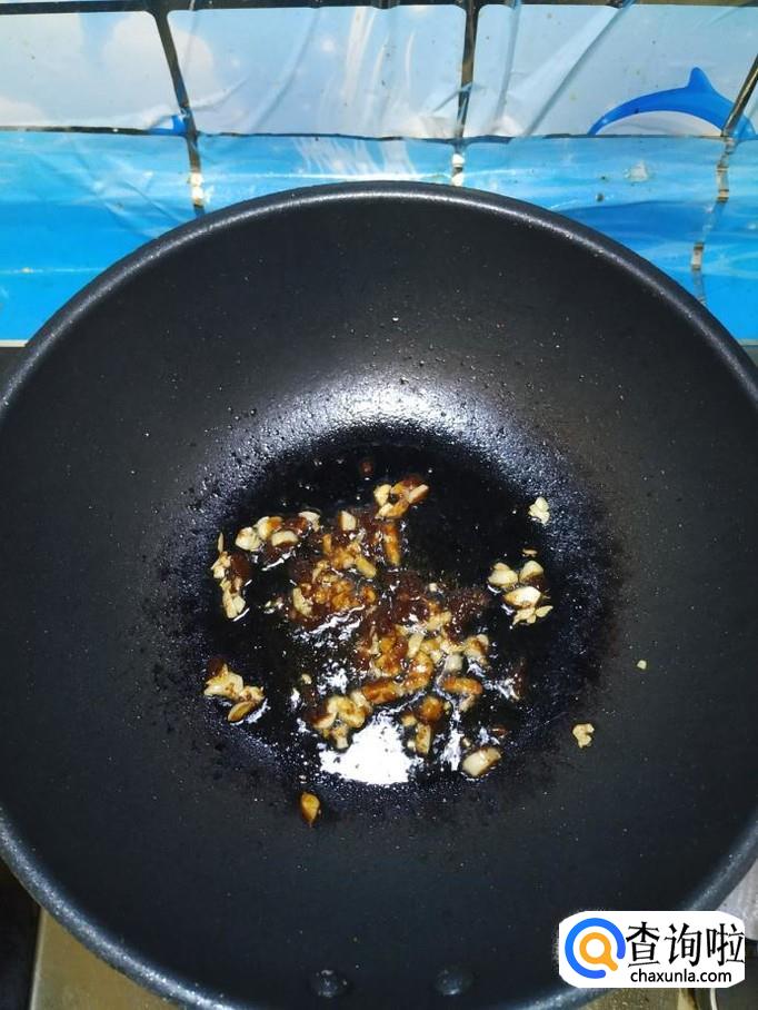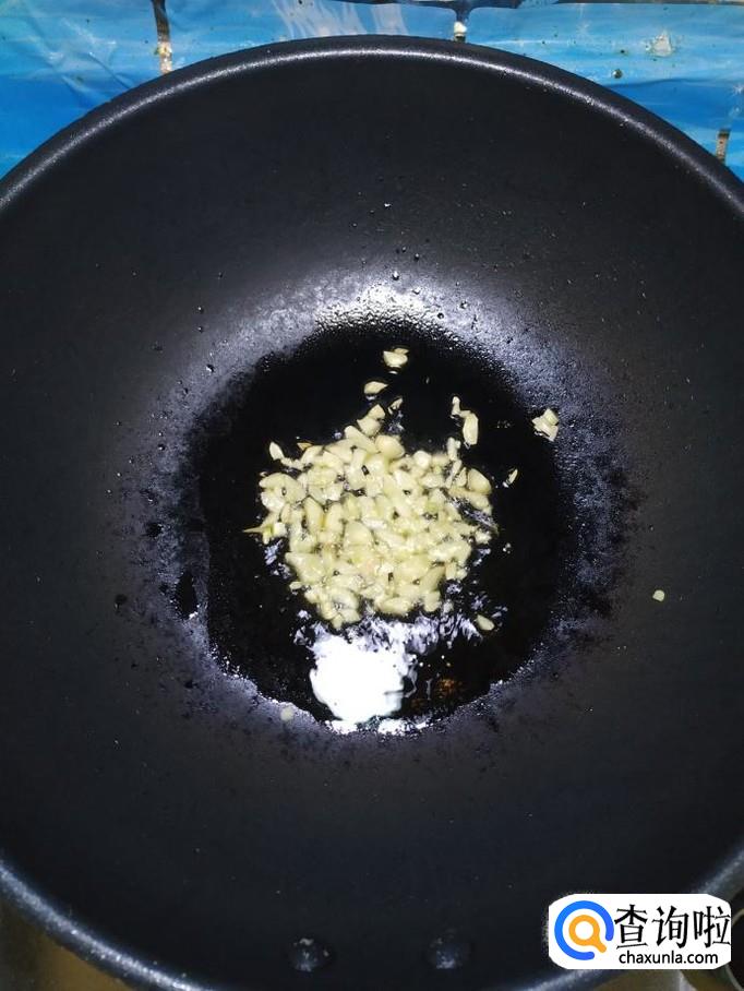 准备适量蒜,去除外衣后切碎,炒锅中放入适量油,油热后,将蒜末倒入锅中炒香。