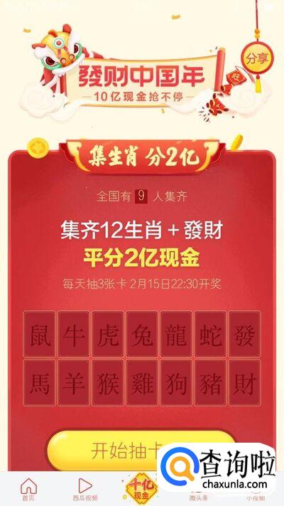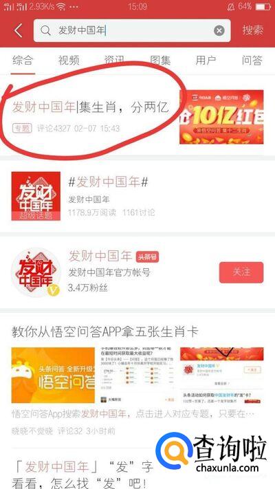 其实还有一个帮助集卡的方式,在今日头条首页面的搜索框中输入“发财中国年”点击搜索,搜索到之后点击第一个带专题图标的。