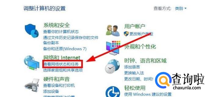 首先我们打开“控制面板”,然后在“网络的Internet”选项卡下面找到蓝色的字体“查看网络状态和任务”,点击进入。