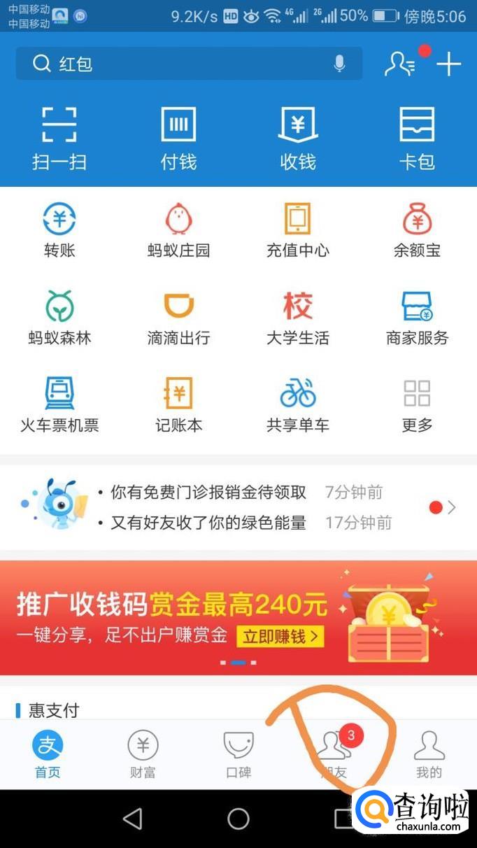 然后,点击最下面一栏的【朋友】(此时有信息提示),如图所示