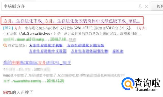 首先,我们打开我们电脑上面的浏览器,然后我们在搜索引擎中输入电脑版方舟,之后我们按回车键,弹出的界面,我们点击图示中的网站;