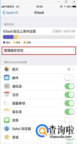 点击后可以看到目前自己的存储空间,一般最初是5GB,再点击“管理储存空间”页面。