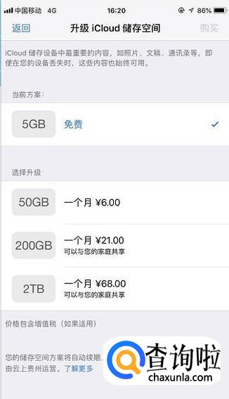 点入后出现升级储存空间的方案,一个月8元升级为50G,一个月21元200G,一个月68元是2TB,大家可以根据自己的实际需要做选择。