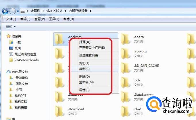 此时,就进入手机存储内部空间了,我们可以在里面对手机文件进行复制、删除等操作,如图所示,右键单击文件或者文件夹即可。