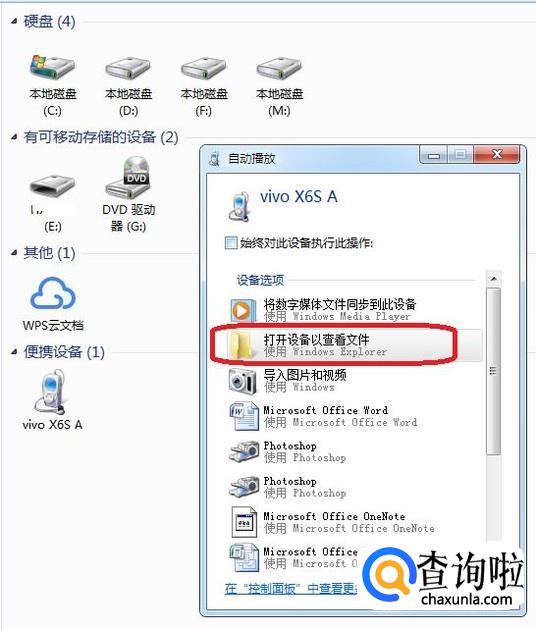 此时,电脑屏幕上会弹出自动播放的提示,如图所示,我们点击“打开设备以查看文件”。