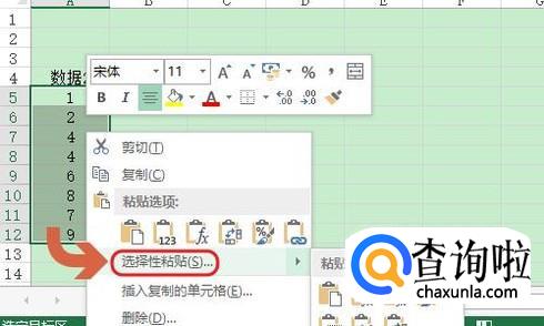 针对两张Excel表格里面的数据核对,我们还有一种方法,那就是首先复制数据1中的所有数据,然后全选数据2中的内容点击鼠标右键“选择性粘贴”;