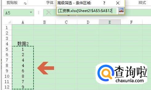然后我们按住鼠标左键框选数据1下面的所有数据,然后将此对话框移动到第二张Excel表格里,点击“条件区域”后面的图标,按照同样的方法框选数据2下列的所有数据;