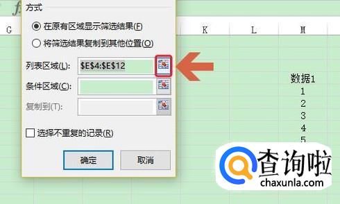 最后一步勾选此对话框中的“将筛选结果复制到其他位置”,然后将“复制到”定位在数据1所在的任意空白单元格,然后我们即可看到两张表格中的相同内容了,如图所示...