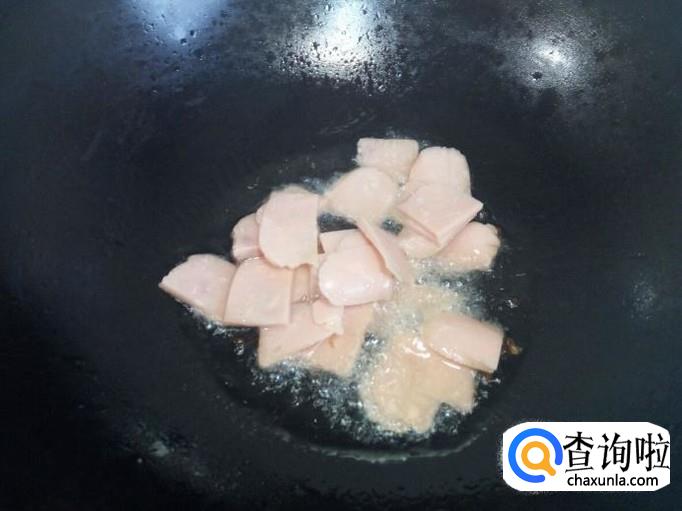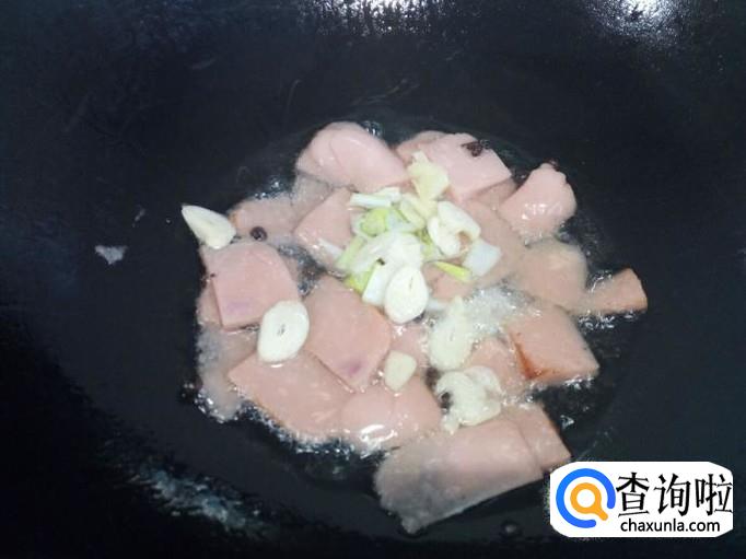 锅里放入油加热,油热后放入花椒爆锅,放入火腿肠小火翻炒。