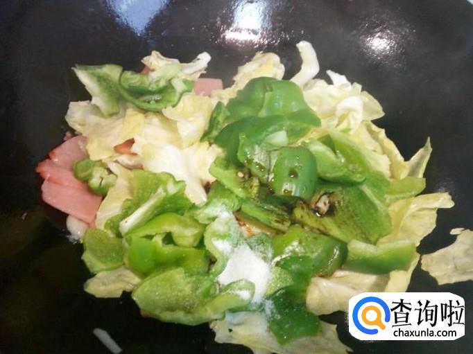 包菜炒至五分熟,放入青椒翻炒,放入酱油,盐。炒至青椒断生,放入味精,关火出勺。