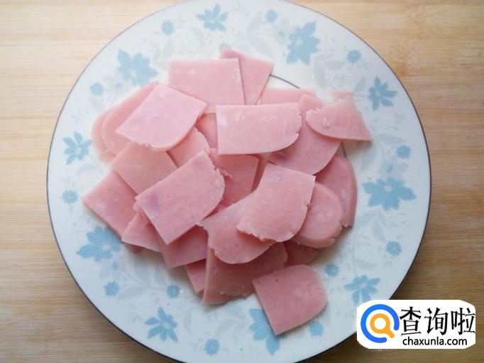 火腿肠去掉外包装,用刀切成片。