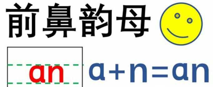 前鼻音韵母有an、ian、uan、üan、en、in、uen、ün,共8个。普通话前鼻音韵母的特点是:韵母的韵尾带舌尖鼻音“n”,一般叫做“前鼻尾韵母”。前鼻音韵母韵尾n,跟声母n的发音大同小异,不同的是n作韵尾时除阻阶段不发音。