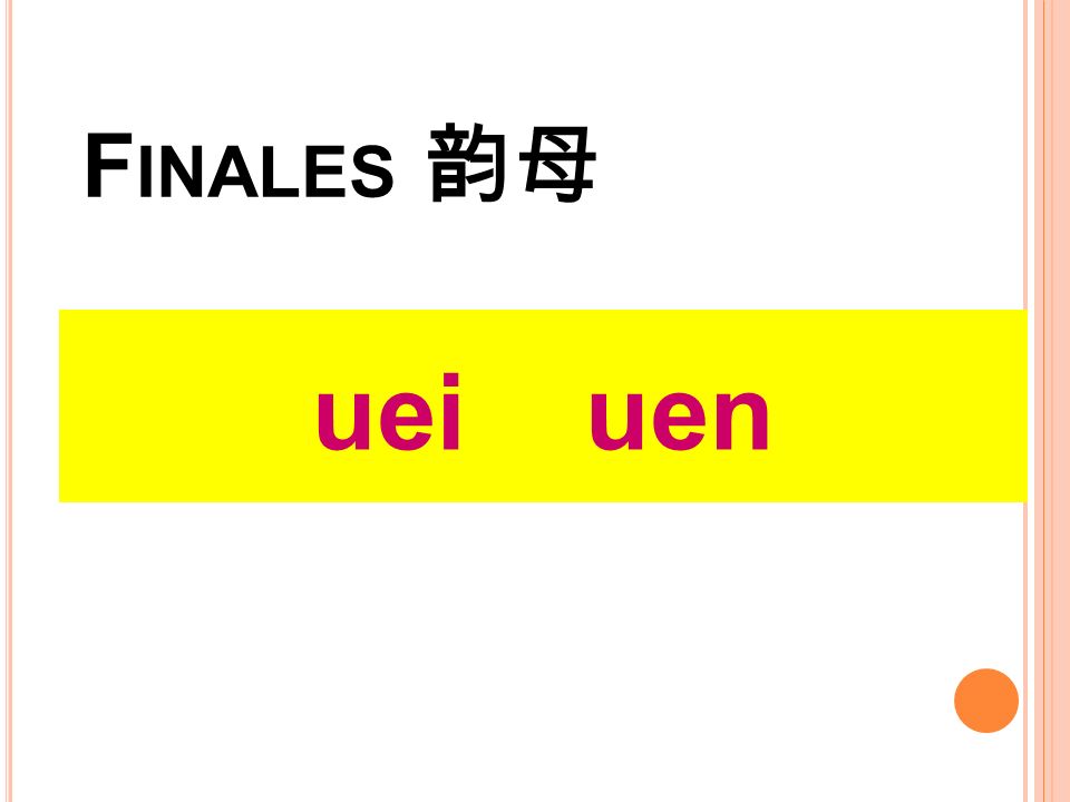 8、uen 发音时,由圆唇的后高元音u[u]开始,向央元音e的位置滑降,然后舌位升高。发e后,软腭下降,逐渐增强鼻音色彩,舌尖迅速移到上齿龈,最后抵住上齿龈做出发鼻音-n的状态。唇形由圆唇在向中间折点元音滑动的过程中渐变为展唇。