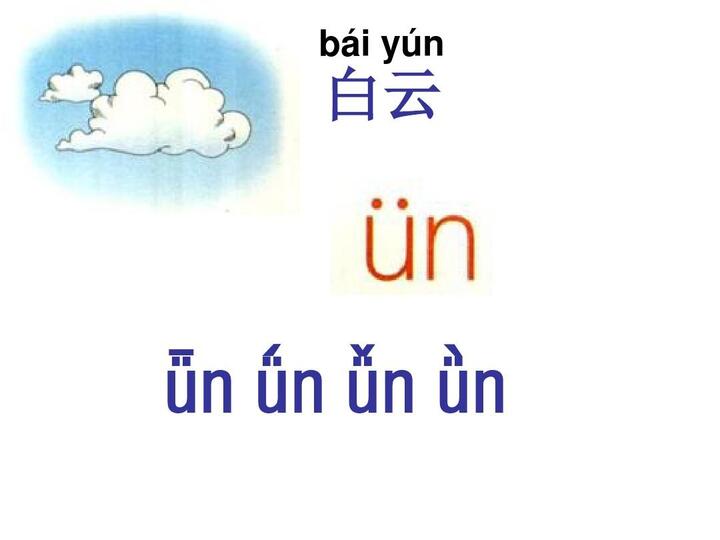 4、ün 发音时,起点元音是前高圆唇元音ü。与in的发音过程基本相同,只是唇形变化不同。从圆唇的前元音ü开始,唇形从圆唇逐步展开,而in的唇形始终是展唇。