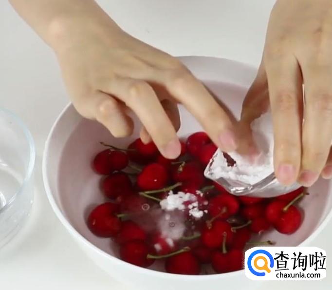 将樱桃放入清水中,倒入适量的碱,如果樱桃打过农药,碱能中和农药的强酸性。