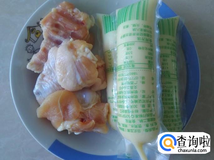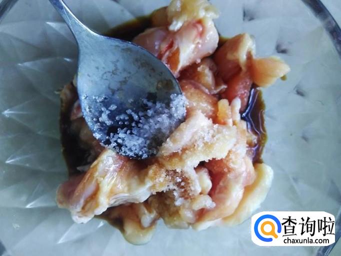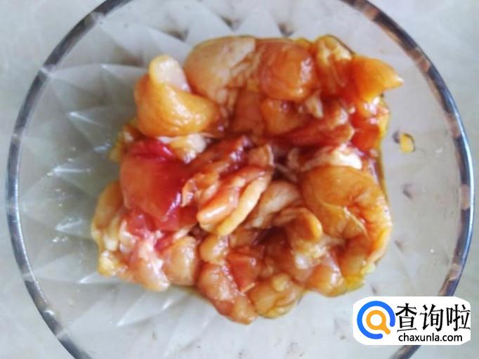 翅腿起肉,切成小块,加适量的盐、姜蓉,1勺生抽、1勺料酒腌制几分钟。