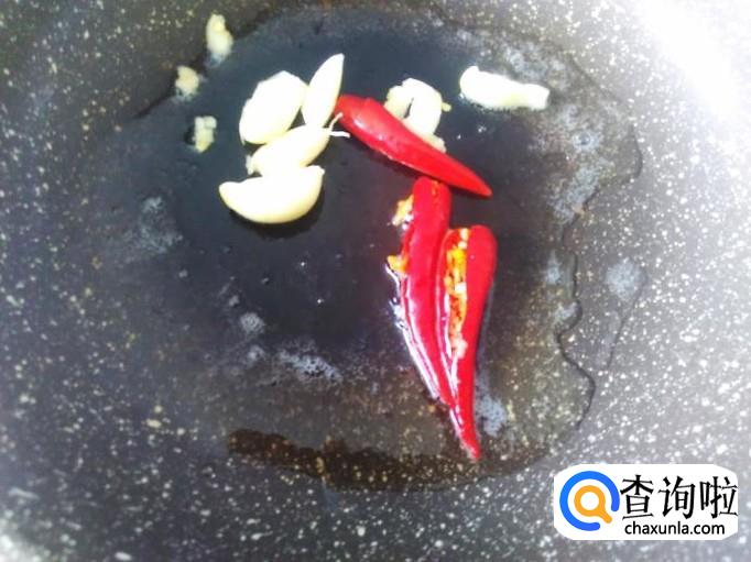 开火下油,放蒜米、小米辣进去爆香。